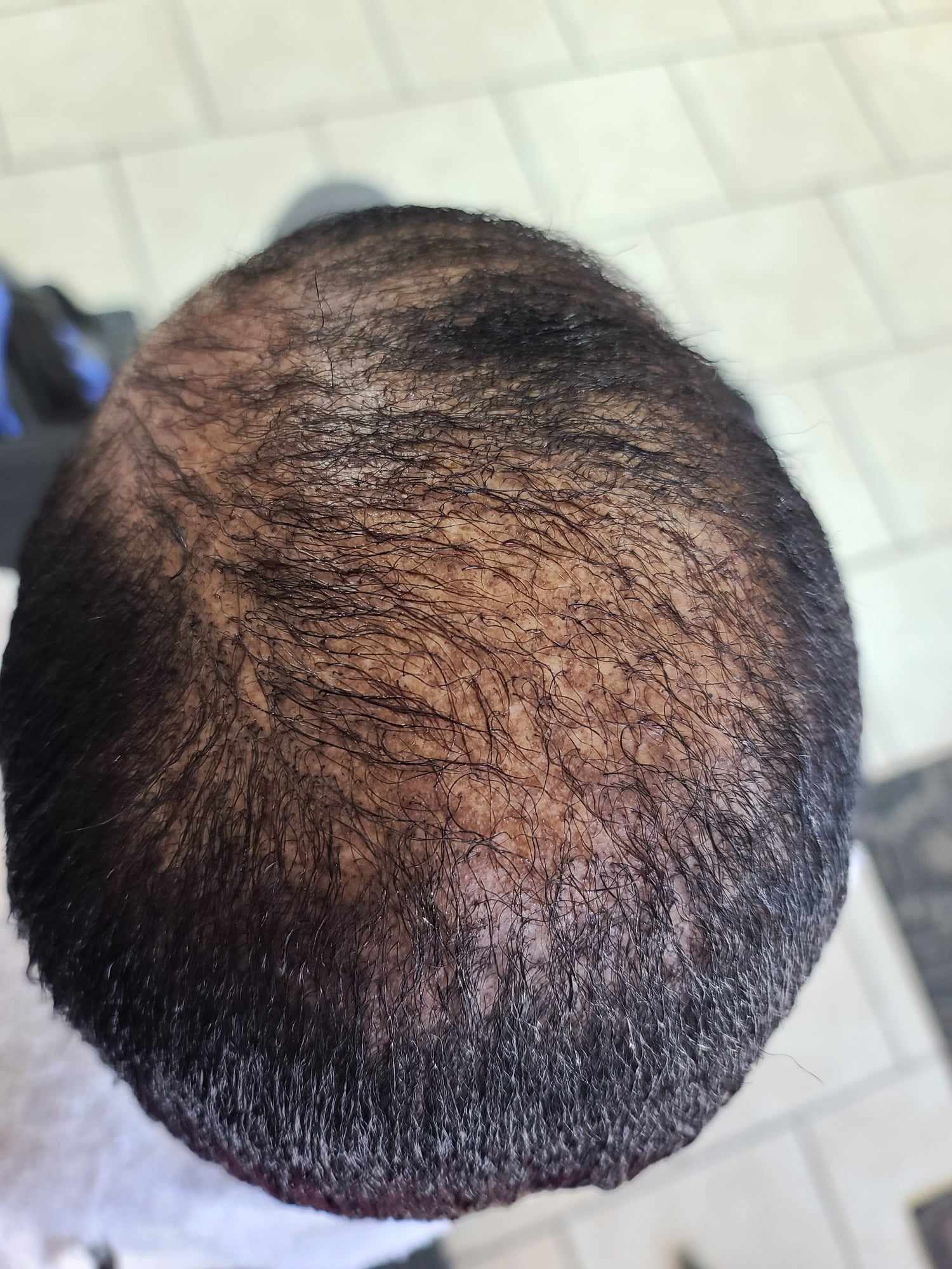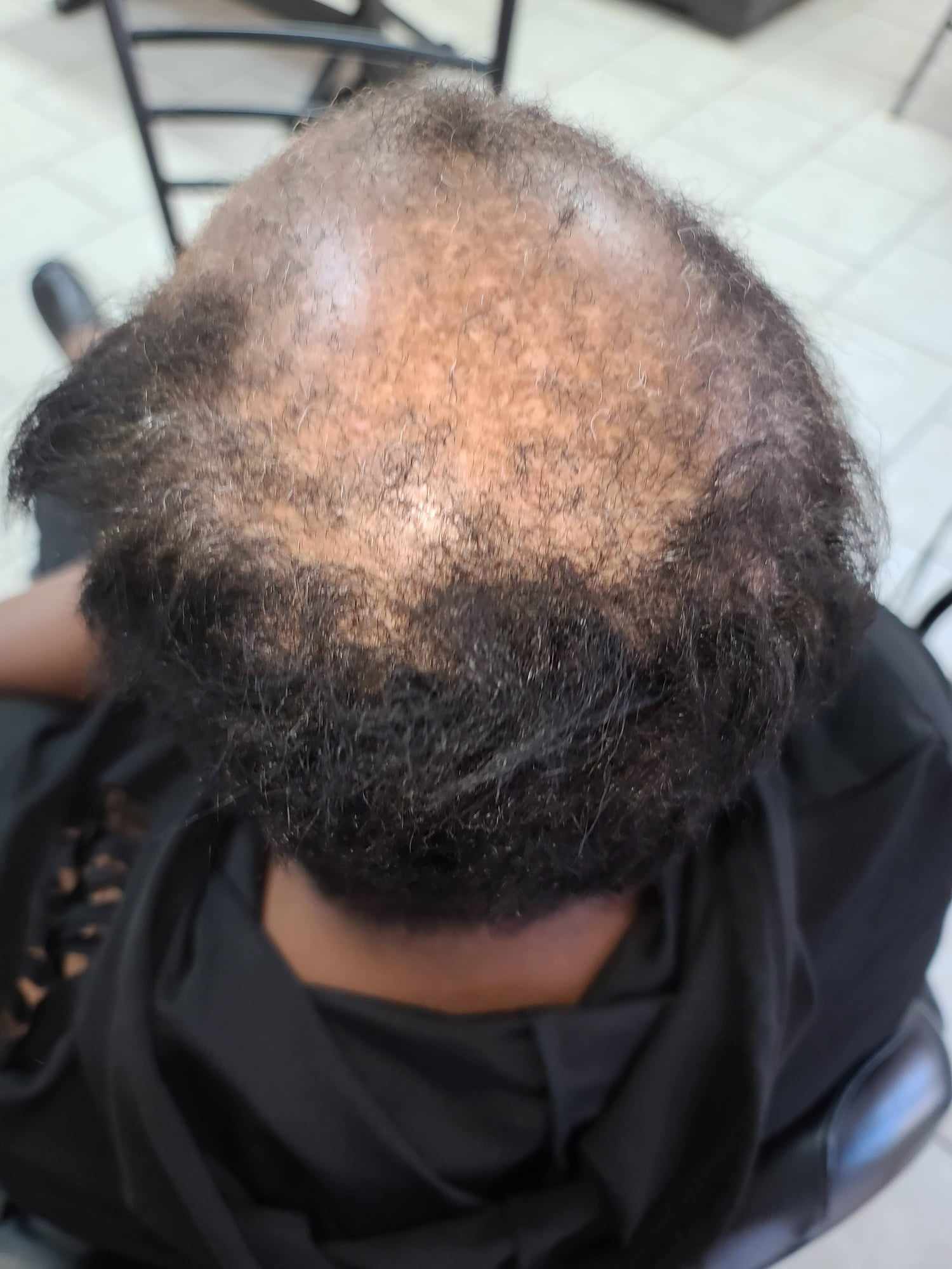 The image shows the top view of a person’s head with noticeable hair thinning and balding. The remaining hair is dark and unevenly distributed across the scalp, revealing visible scalp through thinning hair.